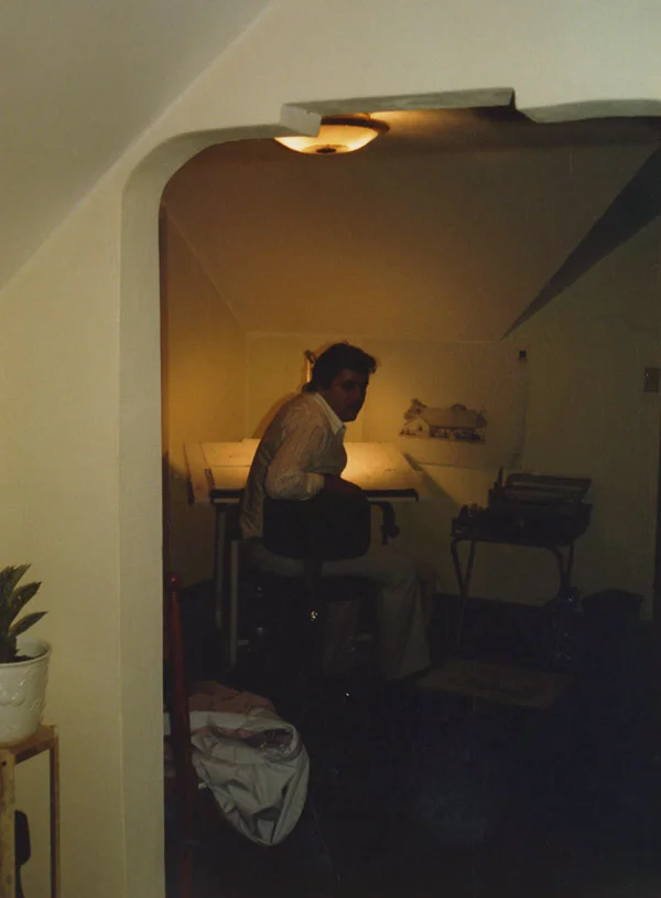 This was the small one bedroom bungalow that Brad and his newlywed rented in Milwaukee in 1985. Brad used the small 8’ x 9’ dining room as a studio. Brad says he remembers that you could only stand up straight in the center of the room as the roof pitched on three of the walls. From here Brad worked on his small fine art pieces and with the small drafting table did everything from graphic work to architectural/interior work. He had his larger studio about a half a mile from the house that he rented for his larger works such as his huge piece titled “The Engagement”. Brad and his wife only lived here for a few years.